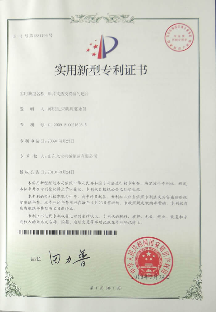 串片式热交换器的翅片-实用新型专利证书