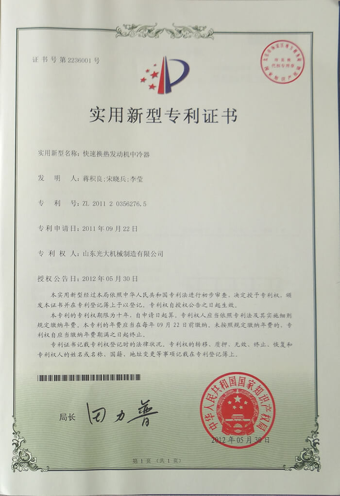 Cooler - utility model patent certificate for rapid heat exchange engine